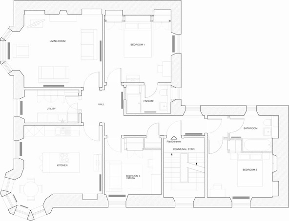 The refurbishment of this flat involved relocating the kitchen to the turret room that was previously a bedroom. This provides the kitchen and dining room with more natural light and views of the activity on the street outside. The existing kitchen is now a guest bedroom and bathroom. An en-suite bathroom has also be added to the master bedroom.